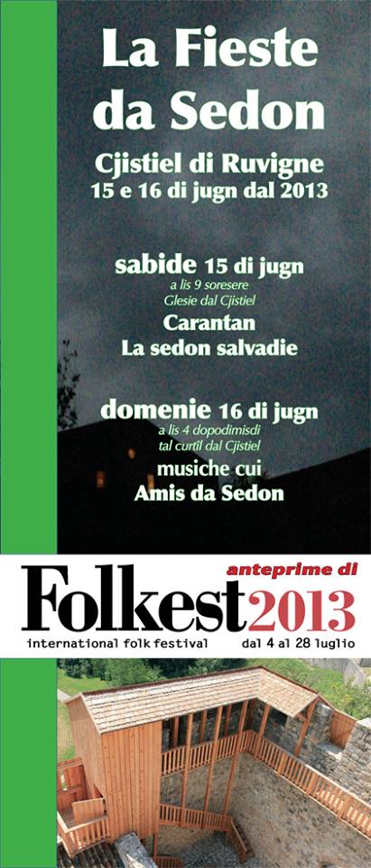 Organizzato dall’Associazione Culturale Folkgiornale, con il patrocinio della Regione Friuli Venezia Giulia, della Provincia di Udine, dell’Unesco, della Fondazione CRUP e del Comune di Ragogna che fin dalla prima edizione ha creduto in questa manifestazione, in uno dei più incantevoli angoli dell’intero Friuli, nel week-end centrale di giugno si celebra la quinta edizione de “La Fieste da Sedon”. Si tratta di un festival dedicato alla musica tradizionale in terra friulana, un ottimo spunto per la valorizzazione di uno dei luoghi storici di maggior significato ricostruiti dopo il terremoto, il Castello dei Conti di Ragogna. Un appuntamento ormai abituale, che solo lo scorso anno non si era svolto per l’indisponibilità della sede, oggetto di importanti restauri. Festeggiata d’onore, la Sedon Salvadie, la storica formazione friulana di musica popolare che celebra nel 2013 i 31 anni di attività, anni che l’hanno vista collaborare con artisti del calibro di Angelo Branduardi, Massimo Bubola, The Chieftains, Carlos Nuñez e Inti Illimani tra gli altri; annoverare nelle proprie fila il meglio del panorama musicale friulano (Giulio Venier, Andrea Del Favero, Lino Straulino, Emma Montanari, Marisa Scuntaro, Dario Marusic, Glauco Toniutti, Flaviano Miani, Gianluca Zanier, tutti hanno militato o militano in questa formazione); dar vita a molti altri gruppi e realtà di ricerca e riproposta (Carantan, Braul, Tischlbong, Montanari Grop, Furclap, Braul, Nosisà, Lino Straulino…).